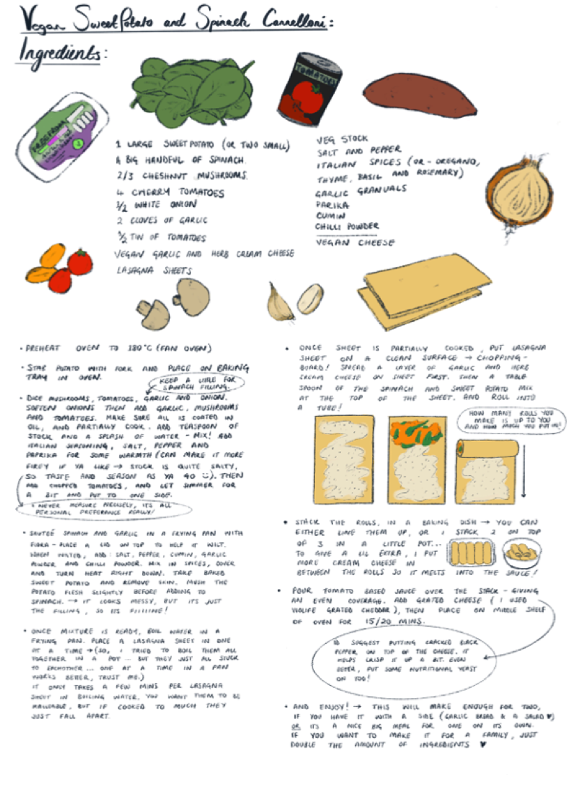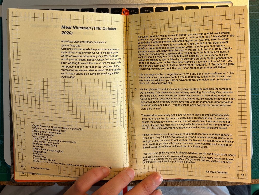 Throughout 2020, we shared monthly meals as part of doing PhD research together. How these meals were shared was altered in March 2020 by the Covid-19 pandemic. This recipe book documents the meals, allowing them to be reinterpreted, and is a diary of the year.